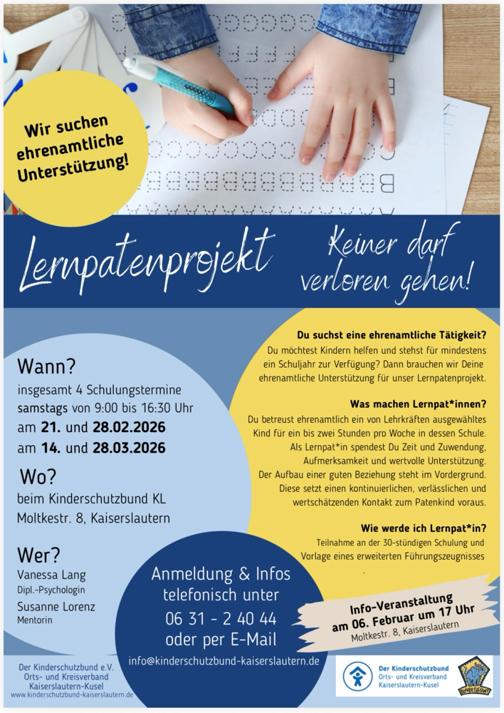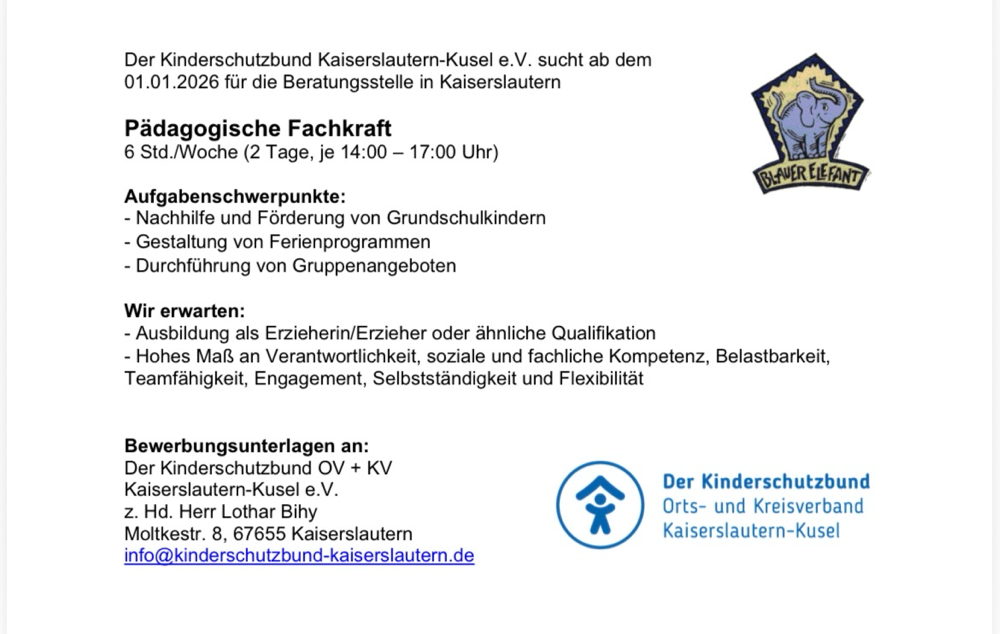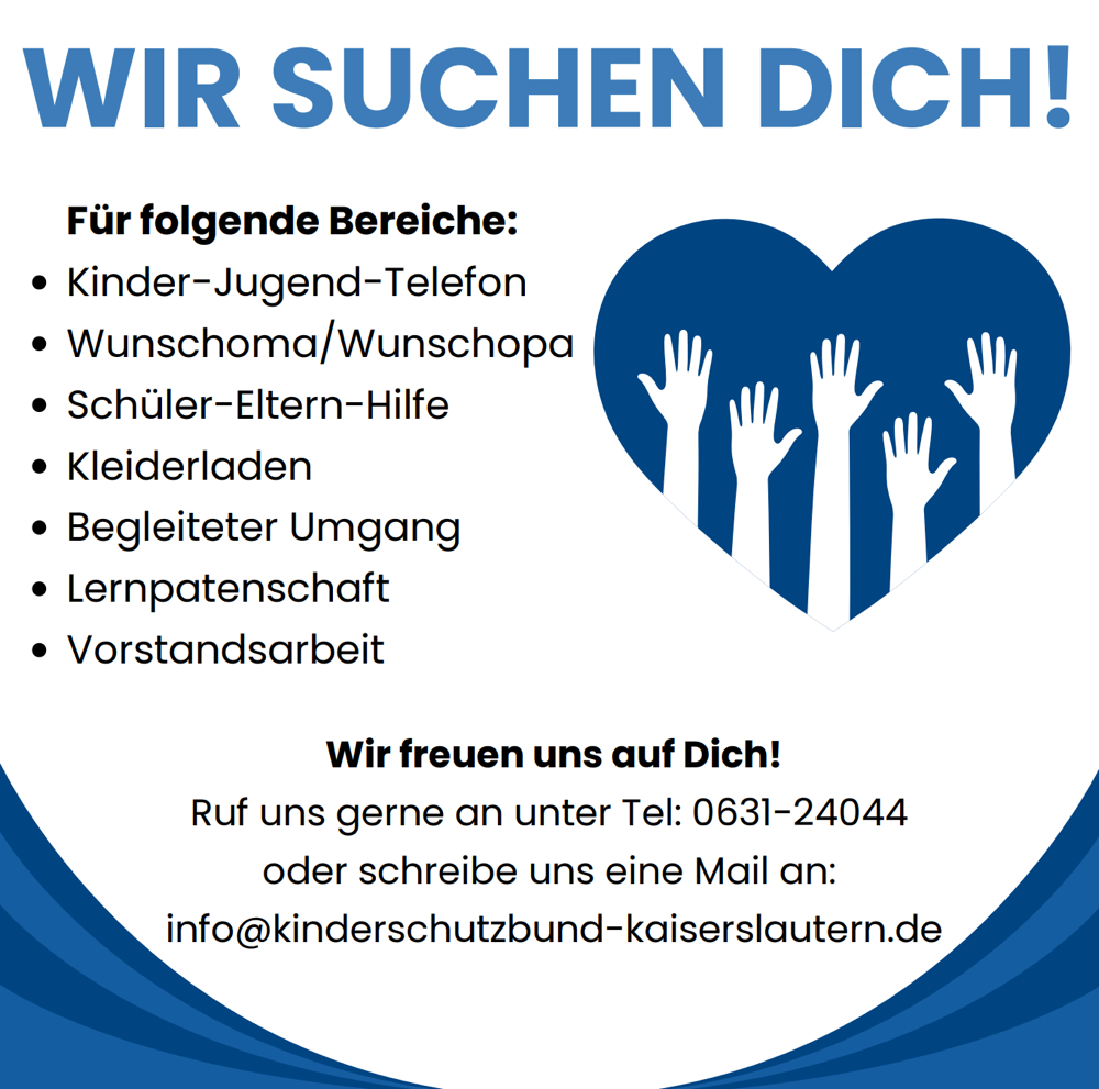 Im Kinderschutzbund können Sie sich für das Wohl der Kinder in Kaiserslautern, Kusel und Umgebung engagieren. Informationen zu den einzelnen Projekten finden Sie hier auf der Website.